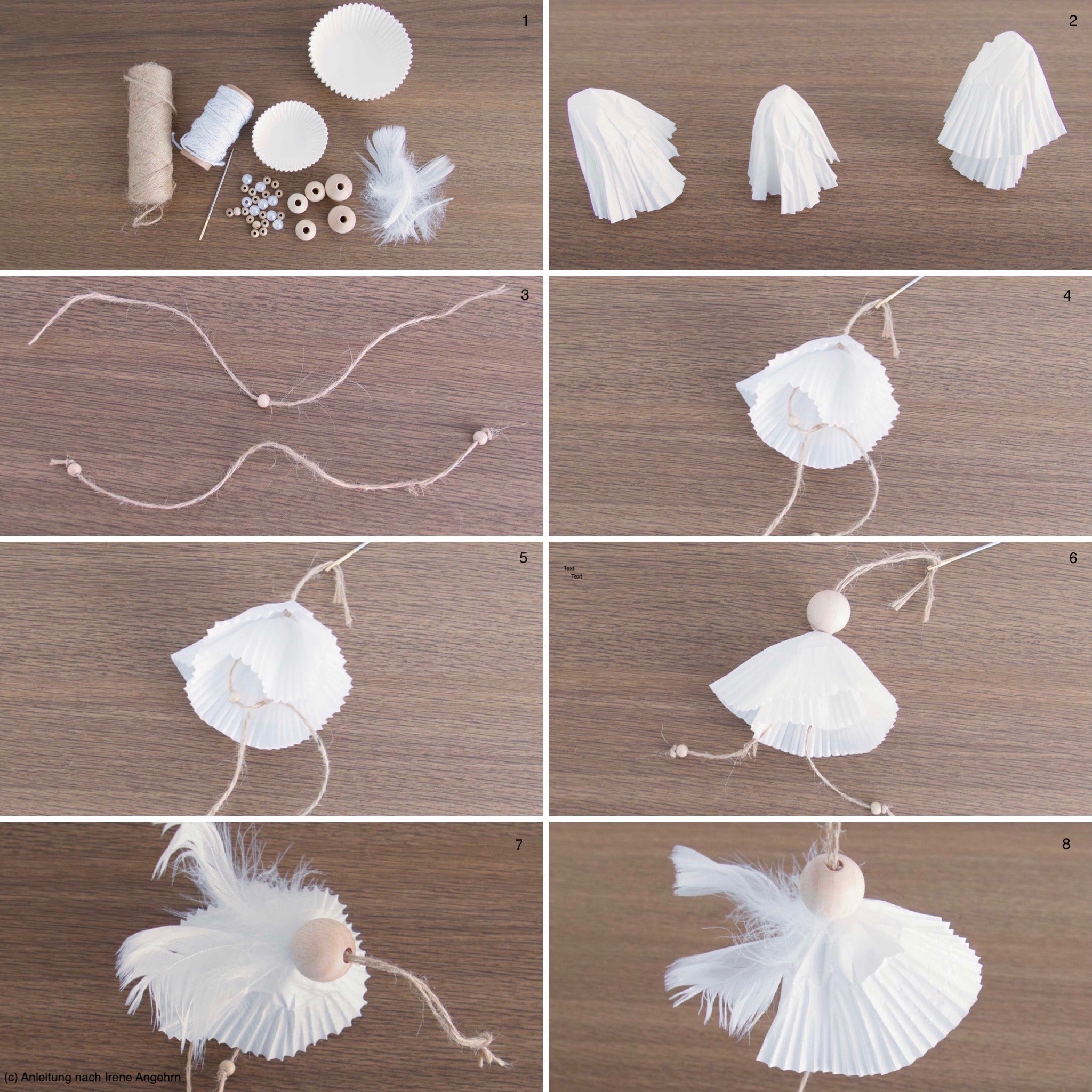 Man braucht: zwei Papier-Muffin-Förmchen, 2 Fäden á ca. 25 cm, 3 kleine Holzperlen (als Füße und zur Stabilisierung des Kopfes), 1 größere Holzperle (als Kopf), 1 Nadel (zum einfacheren Fädeln), 2 Federn